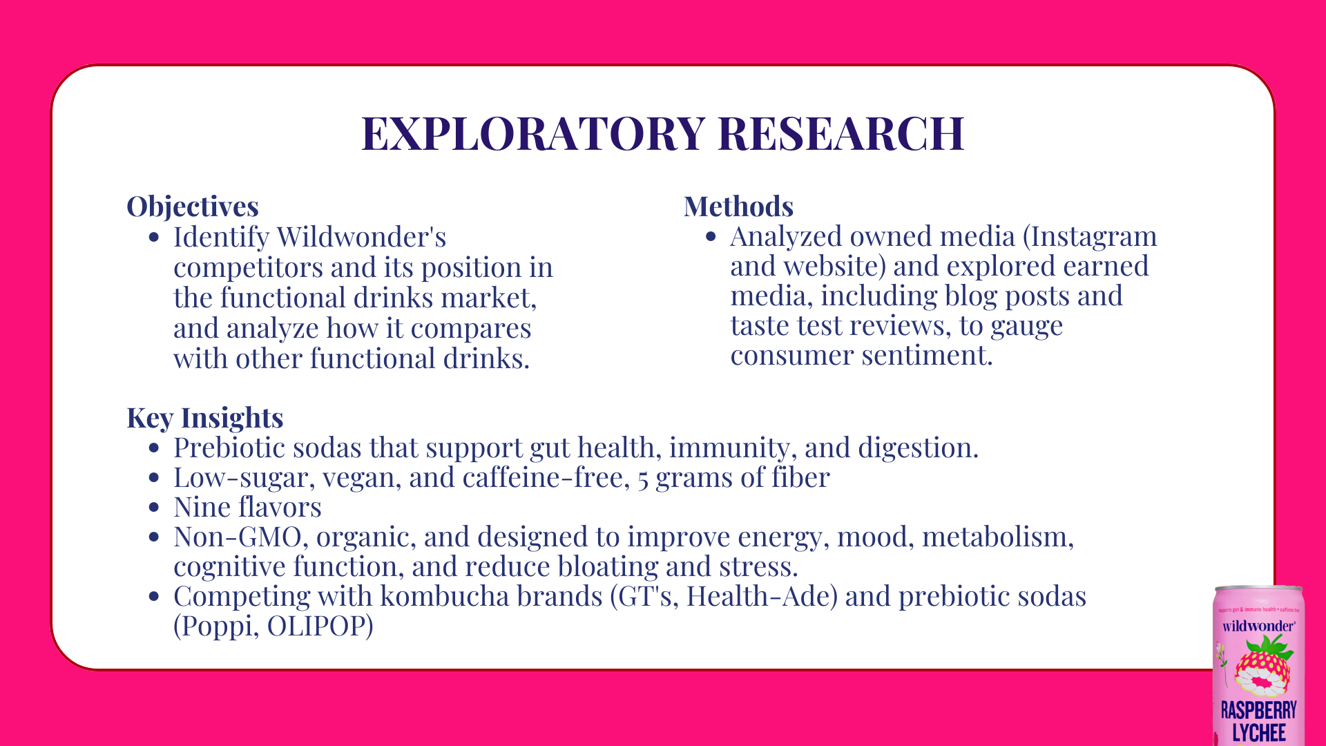 Fall 2024, I took Advertising, Promotion, and Brand Experiences with Professor Scott Hamula. For our final project, we were tasked to choose an existing brand that didn't have a well-identified campaign and create one. Our group chose Wildwonder, a prebiotic soda, and we each worked on aspects of it—research, marketing strategies, developing advertisements, etc—together. Aside from the layout of the competitor analysis and target market profiles (Millie & Alex) I also designed the entire layout of our slide deck (30 slides)! 🍓🫐